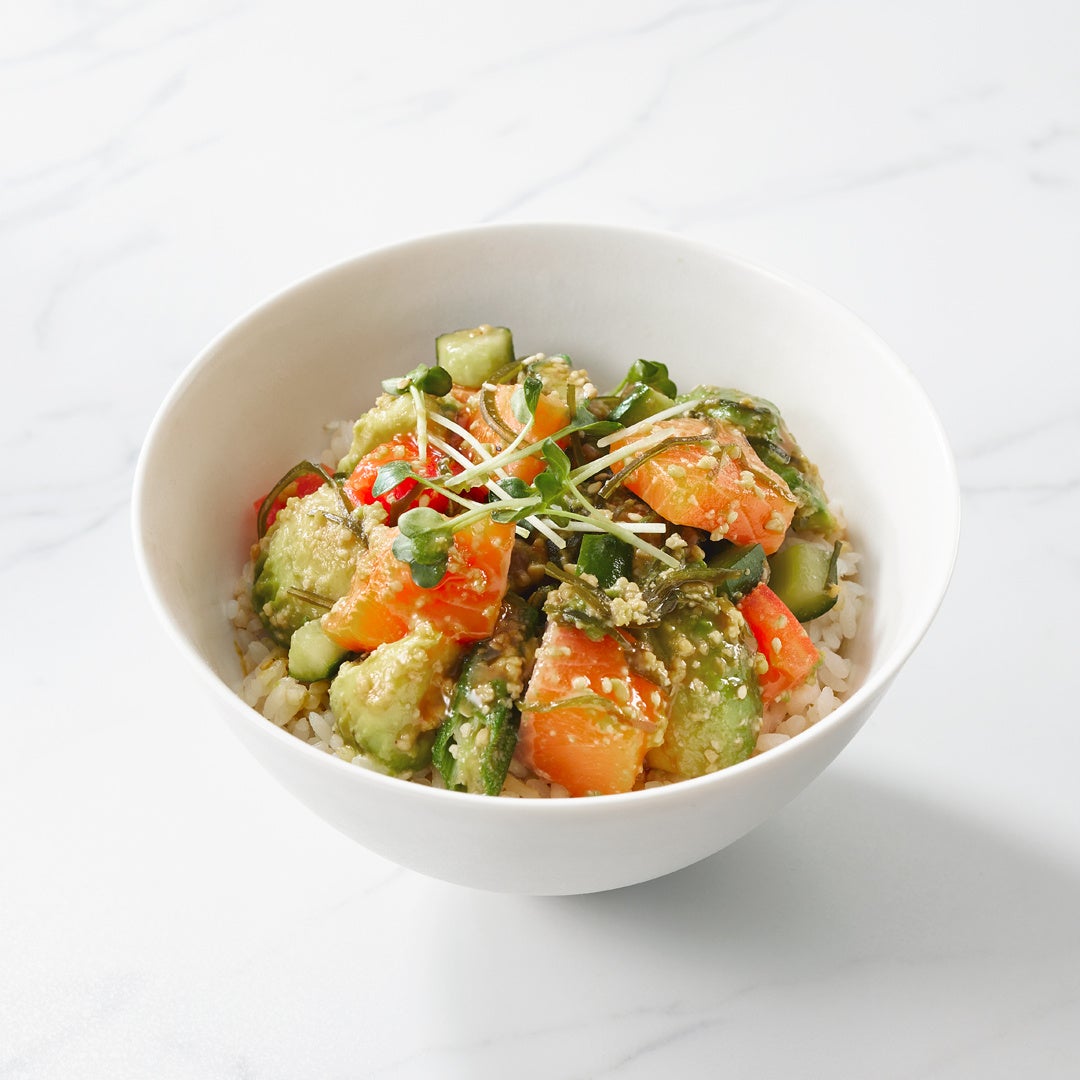 上品な脂のりとやわらかな口当たりが特徴のサーモンに、なめらかな食感のアボカド、オクラやトマト、きゅうり、くきわかめなどを合わせました。店内仕込みの生しょうゆ麹を使った特製だれが、旨味と深みを引き立てます。