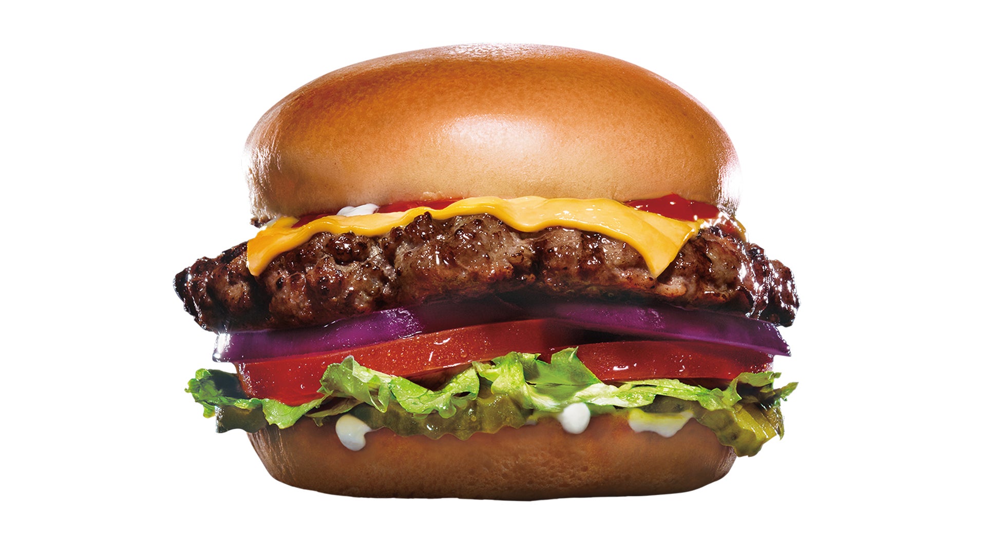 カールスジュニア®の看板バーガーといえばこのメニュー!直火でじっくりと丁寧に焼き上げた100%オージービーフの100gパティとレタス、トマト、オニオン、ピクルス、チェダーチーズを使用しており、アメリカのカールスジュニア®で愛されている、トマトベースのオリジナルスペシャルソースとマヨネーズがかかったクラシカルなハンバーガーです。