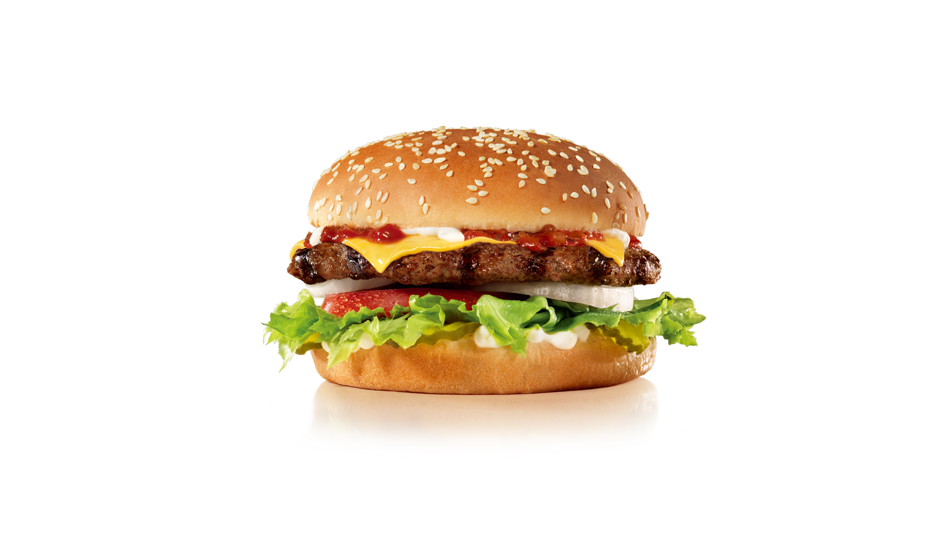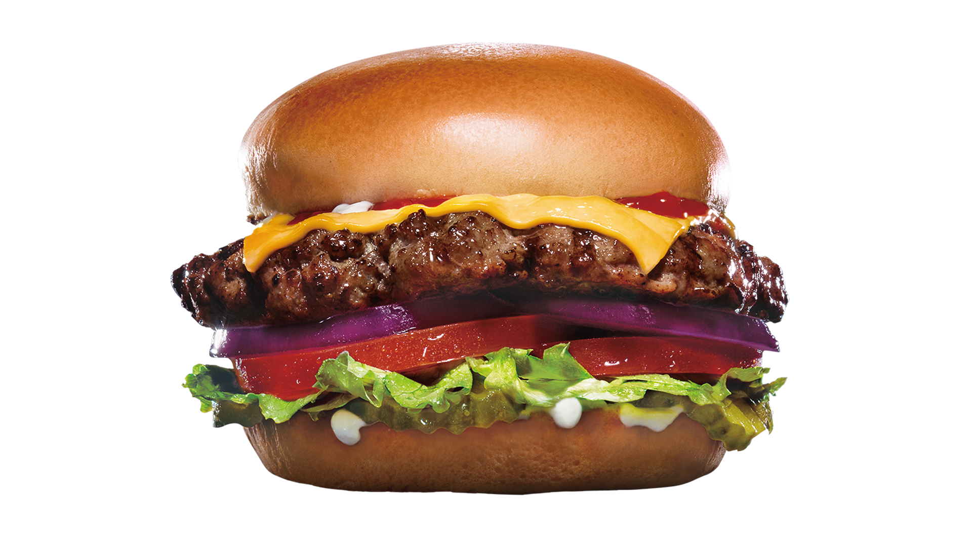 カールスジュニア®の看板バーガーといえばこのメニュー!直火でじっくりと丁寧に焼き上げた100%オージービーフの100gパティとレタス、トマト、オニオン、ピクルス、チェダーチーズを使用しており、アメリカのカールスジュニア®で愛されている、トマトベースのオリジナルスペシャルソースとマヨネーズがかかったクラシカルなハンバーガーです。
