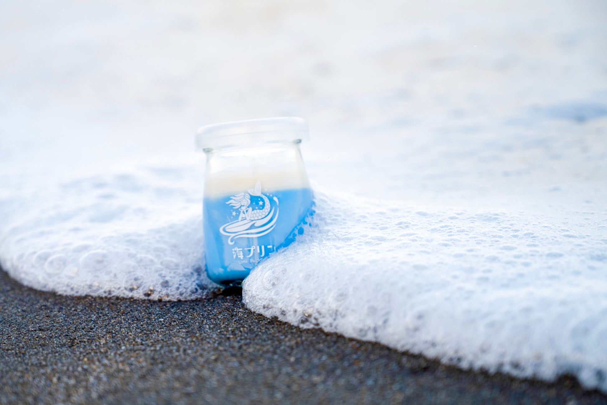 人魚の海プリンちゃんが千葉の海から海の恵みの海プリンをお届けする物語を瓶のロゴマークに詰め込みました。尻尾が天高く跳ね上がっている様にみなさんも上昇して笑顔になりますようにと思いを込めて作りました。みなさんの日常の中で、海プリンを見て癒されて、食べてほっと一息出来るようなリラックスしたひと時を過ごして欲しい。みんなに愛される海プリンになって欲しい。と願いを込めて。