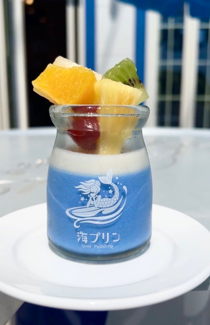 コロナの時にお客様が減り悩んでいた時に、主人から次はスイーツだね!の一言から始まりました。大好きな海をイメージしたデザートを作ろう、食べ歩きをする程プリンが好き、海をイメージした青いプリンを作ろうと最初に決めました。こだわったのは、海の青い色と美味しいプリンの味でした。そこから1年半試行錯誤し、海をイメージした海プリンが完成しました。隠し味としてメープルシロップの優しい甘みをキャラメルとなる白にとじこめお子様も食べやすい味に仕上げました。2023年よりとろける奇跡の青いプリン『海プリン』テイクアウト専門店をオープンする事ができました。