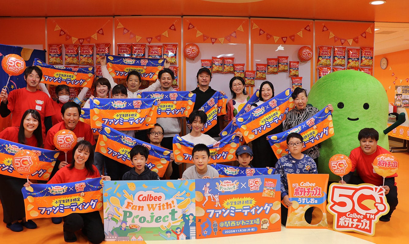 カルビーは1949年の創立以来、「かっぱえびせん」「ポテトチップス」「フルグラ®」「じゃがりこ」など、数多くの商品を発売してまいりました。そんなカルビー商品をご愛顧いただいているファンの皆さまと実際にお会いし、繋がりを深めたいという想いから、2024年にカルビー初となる全国規模のファンミーティング『Fan With! Project』を実施。全国17カ所の拠点で展開し約600名のファンの皆さまにご参加いただきました。2025年度はグループ会社「カルビーポテト」や他社との協業型ファンミーティングを初開催し、ファイナルとなる2026年3月21日(土)には、海外で初となる香港でファンミーティングを実施。累計1,000名以上のファンと約700名の従業員がプロジェクトを通して交流してまいりました。