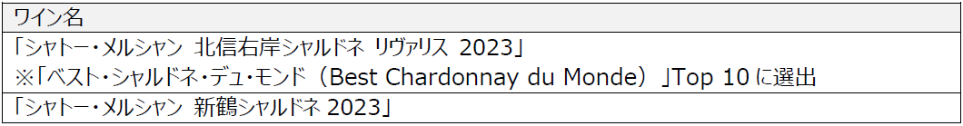 また「シャトー・メルシャン 北信右岸シャルドネ リヴァリス 2023」は、その年に出品された世界各国のシャルドネの中から、国際的に高い評価を受けたワインとして「シャルドネ・デュ・モンド」における最上位選出「ベスト・シャルドネ・デュ・モンド(Best Chardonnay du Monde)」TOP 10に選ばれました。