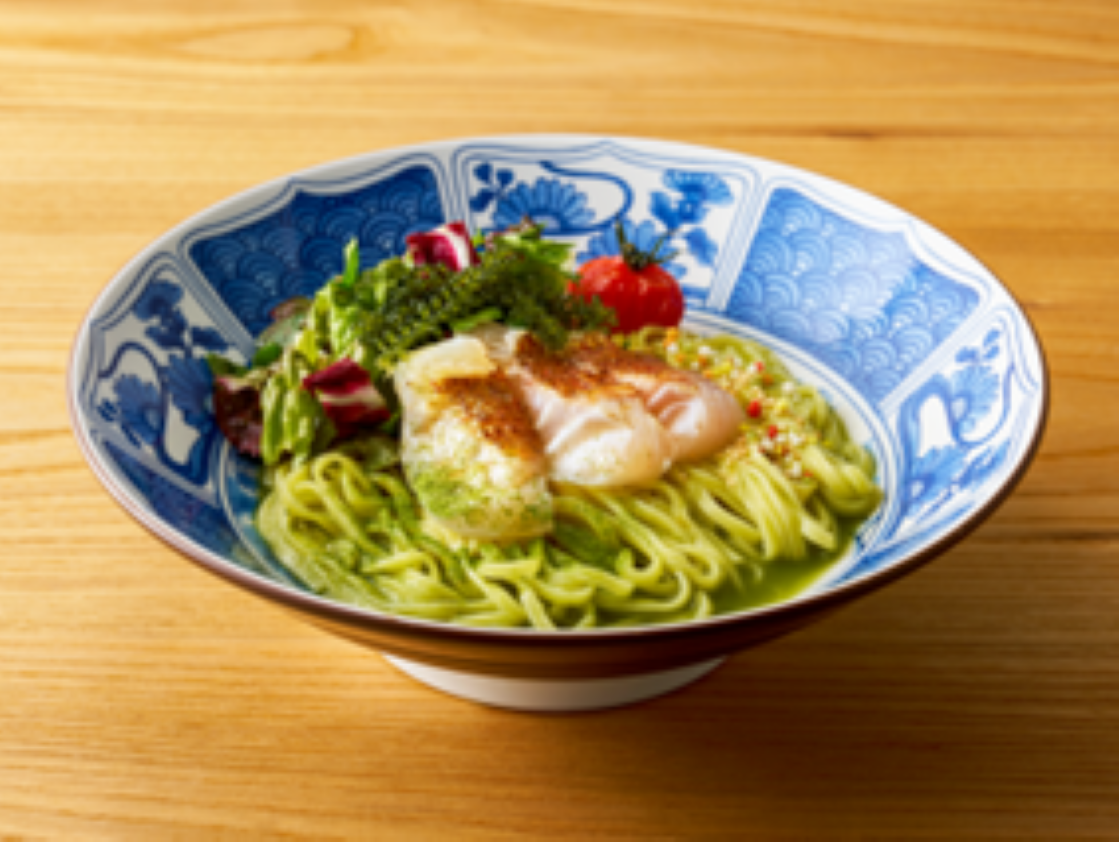 真鯛の出汁をベースにしたやさしい味わいの和え麺に、真鯛の昆布締めを添え、抹茶の香りをアクセントに。おすすめは、高知県産ゆずを練り込んだ爽やかなゆず麺です。