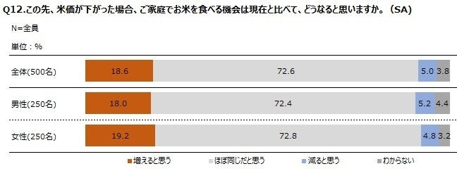 今後の米価格の低下局面における米食の意向を質問したところ、「ほぼ同じだと思う」が72.6%であった。約7割が現状を継続したいとした。対して、現在よりも米食が「増えると思う」は18.6%であり、「減ると思う」は5.0%、「わからない」は3.8%に留まった。米価格高騰後の食習慣を今後も継続したい人が多数を占めた。外国米の喫食が増えたり、昼食で米以外の食材を選んだり、今回の調査においても食習慣の変化がいくつか散見されたが、多くの消費者はそこに戻ろうとは思っていない。