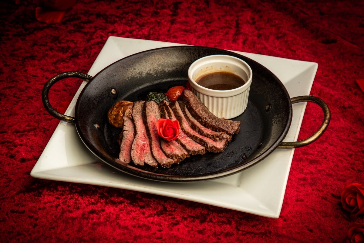 プレミアムコースのメイン料理にも”火炙り”は執行されてしまいます…炎が鎮まった鉄板の上には香ばしさとジューシーさのベストバランスを保って焼き上がった和牛肉が!脇に寄り添う玉ねぎと醤油がベースとなったシャリアピンソースが肉本来の旨さを引き立て、洋の東西を問わず訪れるお客人の舌を満足させます。