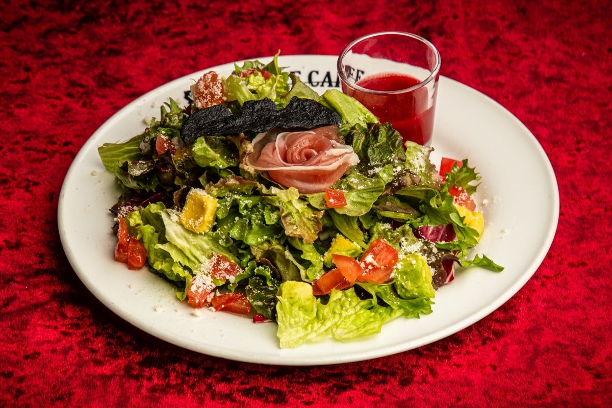 “火炙り刑”以上にこの館で執り行われてきた”復活の儀式”。魔界の住人たちとコール&レスポンスで呪文を唱え、“血”を注ぐことで、死した野菜は甦り美味なるサラダへと転生します。アラカルトメニューの中でも、常にオーダー率トップを争うこの儀式無くして、記念の宴の幕は開けられません…!