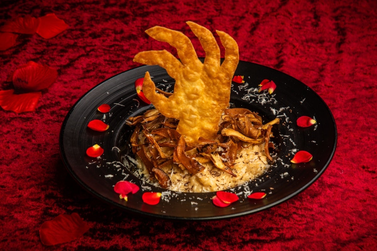 暗闇から運ばれる漆黒の皿に突き立つ恐ろしげな手にたじろいだその瞬間。不意に鼻をかすめる蠱惑的な薫り…正体は世界3大珍味に数えられるトリュフと、イタリアの伝統的なチーズとして名高いペコリーノ。種々のきのこ達とチーズが奏でる美食のオーケストラこそ、貴方を絡め取ろうとする”魔の手、なのかも。