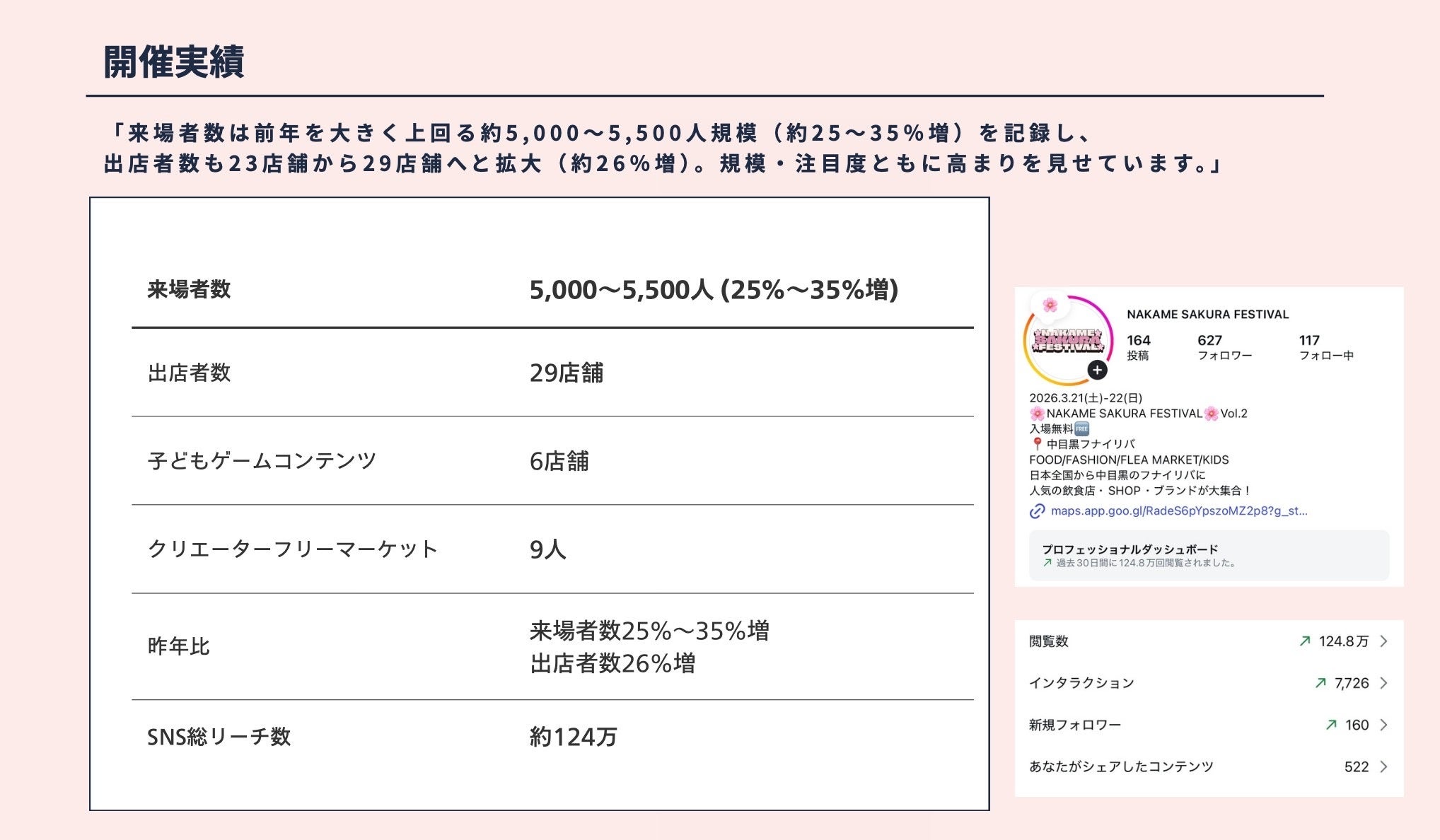 株式会社MANIC MONDAY(所在地:東京都目黒区/代表取締役:古賀あかね)は、2026年3月21日(土)・22日(日)の2日間、中目黒・フナイリバにて「NAKAME SAKURA FESTIVAL」を開催し、約5,000〜5,500人の来場者を迎え、盛況のうちに終了したことをお知らせいたします。
