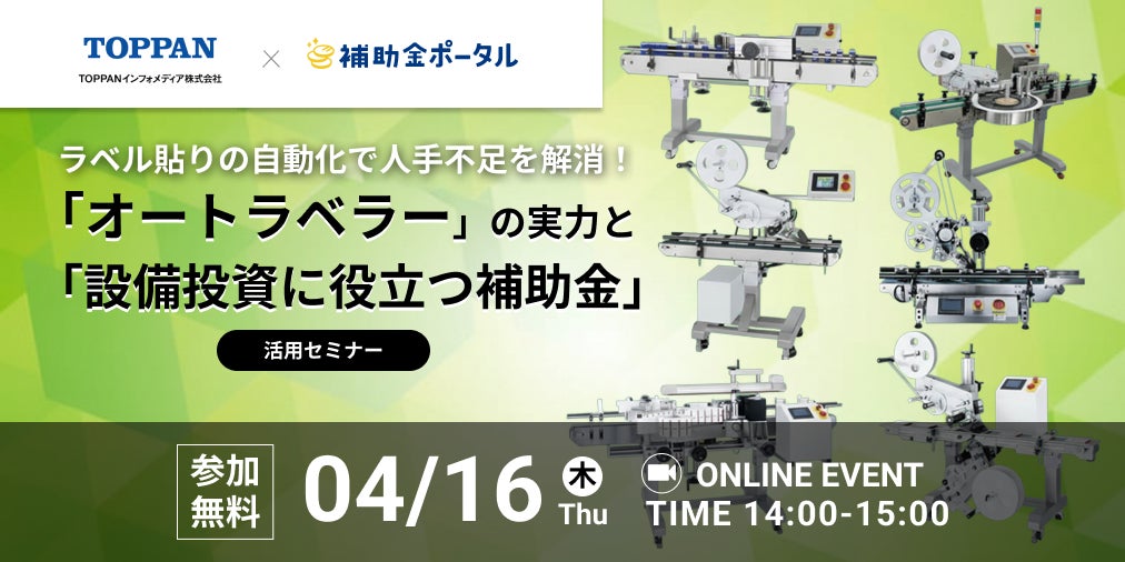 株式会社補助金ポータル(本社:東京都渋谷区、代表取締役:福井彰次)は、TOPPANインフォメディアと共催で、「ラベル貼りの自動化で人手不足を解消!「オートラベラー」の実力と「設備投資に役立つ補助金」活用セミナー」無料オンラインセミナーを、4月16日(木)14:00より開催いたします。エネルギー価格の高騰や深刻な人手不足への対応、生産現場のDX推進など、製造・物流業界が抱える課題解決に向けた自動化ソリューションと、その導入を後押しする補助金の活用法を解説します。