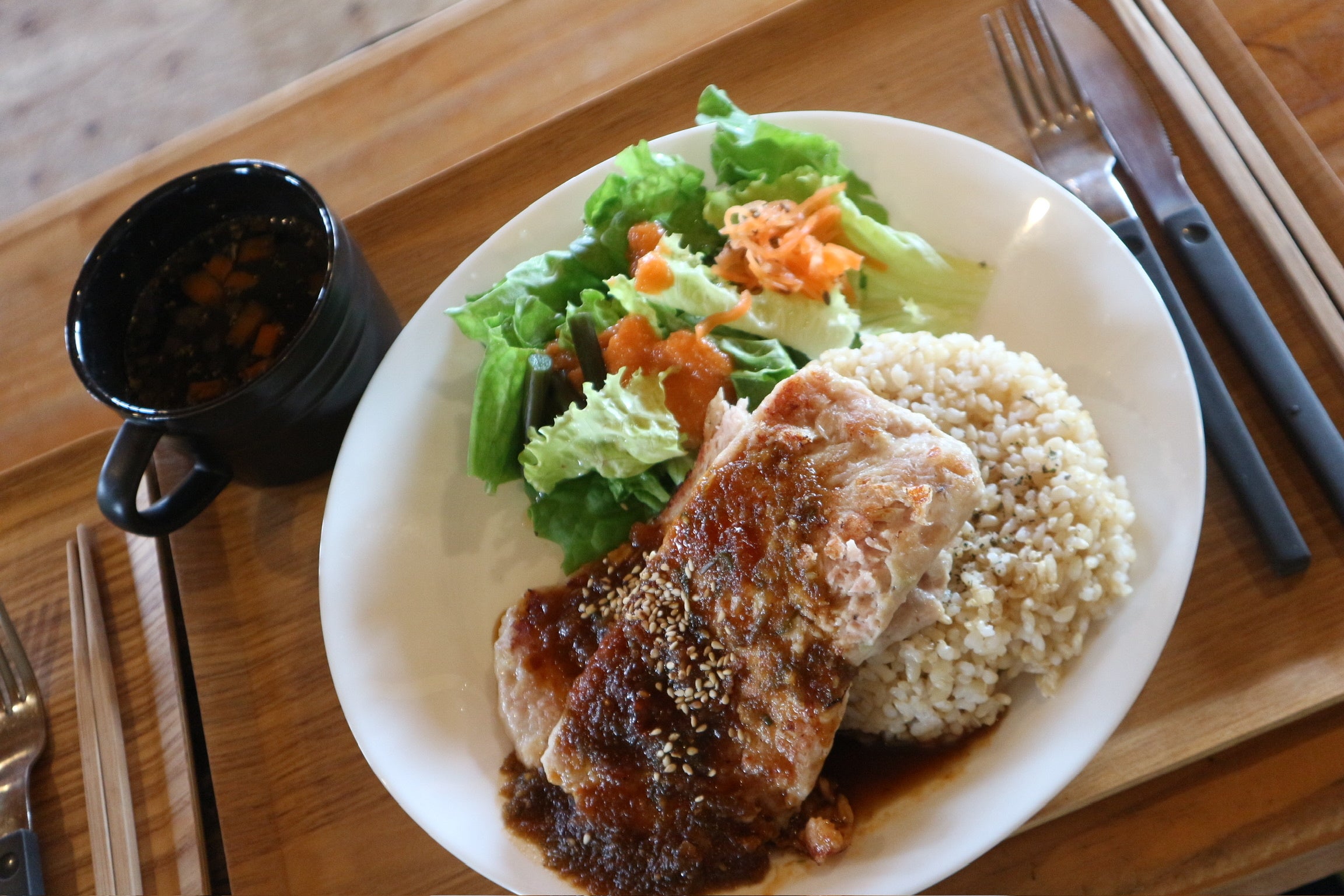 健康を考えたヘルシーハンバーグ。玄米・サラダと一緒にワンプレートでご提供。