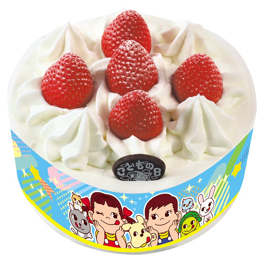 シャンテリークリームとスライス苺をスポンジでサンドし、ペコちゃんポコちゃんとゆかいな仲間たちの楽しいイラストがデザインされた巻き帯で飾った苺のショートケーキです。こどもの日のお祝いにぴったりです。