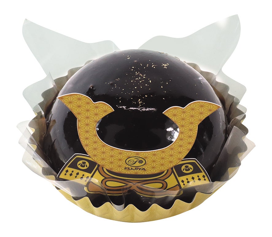 ココアスポンジにプリン、チョコムースを重ね、チョコグラサージュでコーティングしたかぶと型のケーキです。上面は金粉で華やかに仕上げました。