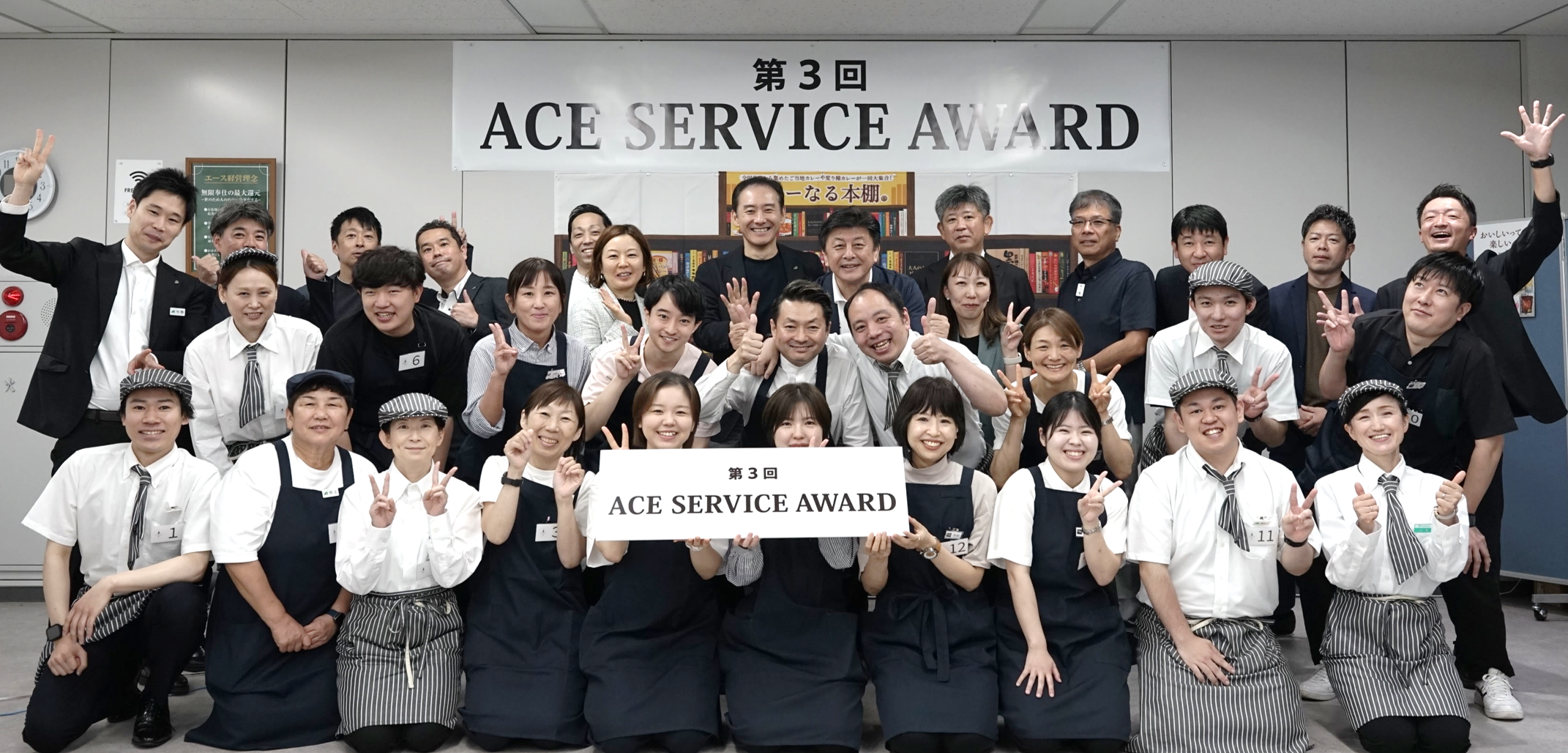 お客様によりよいお買い物体験をしていただくため、2023年から接客力向上を目的とした社内接客コンテスト「ACE SERVICE AWARD」がスタート。1年に一度、全国の店舗から接客が好きなスタッフが集まり、切磋琢磨する接客ロールプレイング大会が開催しています。写真は、2025年開催「第3回ACE SERVICE AWARD」にて『楽しいポーズでお願いします!』の掛け声とともに撮影されたもの。歴代大会の最終審査出場者は、「ACE SERVICE AWARDバッジ」を店舗にて着用しています。商品選びなどでお困りの際は、ぜひお近くの北野エーススタッフへお声がけください。また、2026年秋には「第4回ACE SERVICE AWARD」の開催を予定しています。