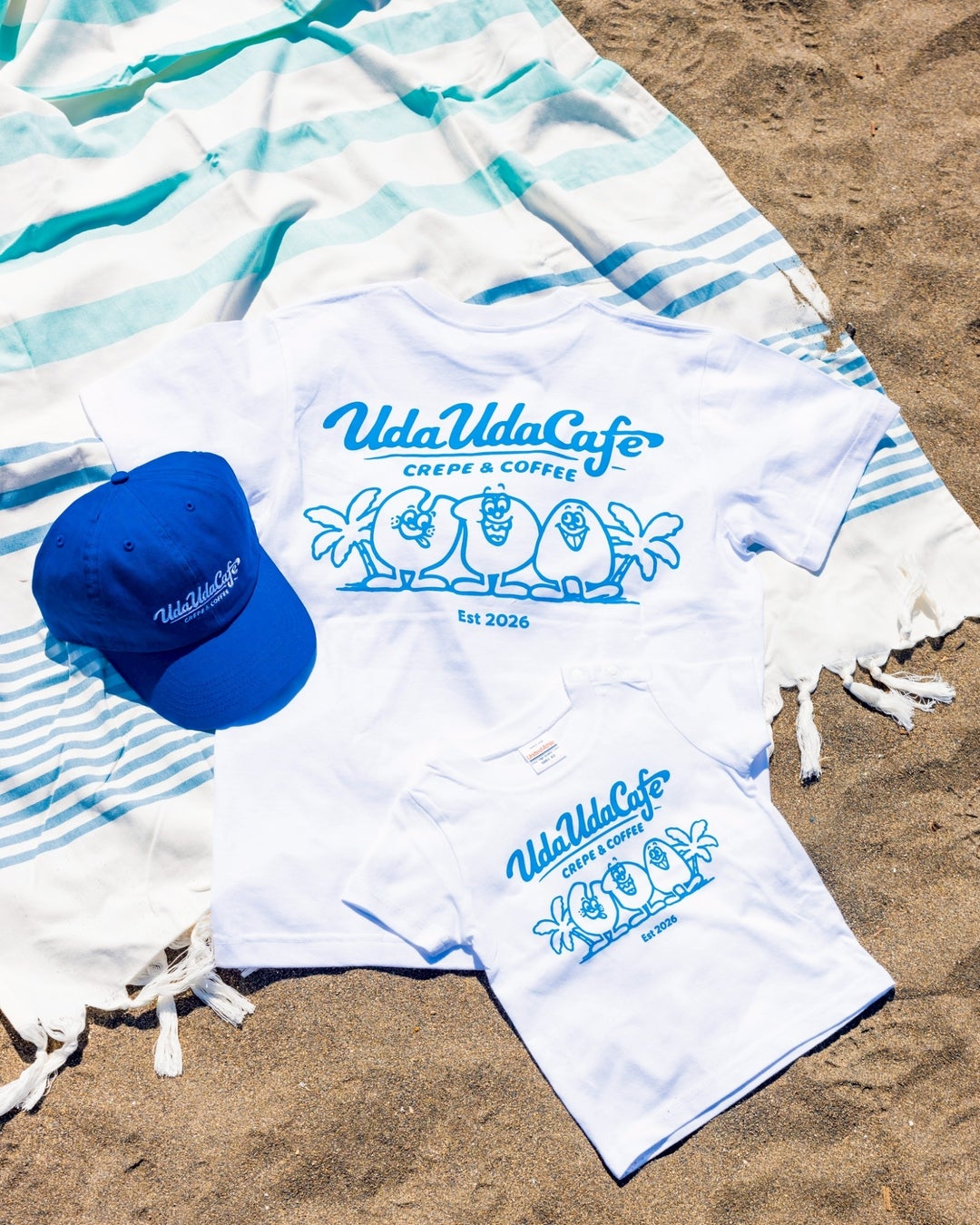 親子リンクコーデでおでかけをもっと楽しくする、アパレルグッズを販売。UDAUDACAFEのロゴのアメリカンなブルーが湘南の海に映える、さりげなく可愛らしいTシャツやデニム生地のキャップなども販売します。