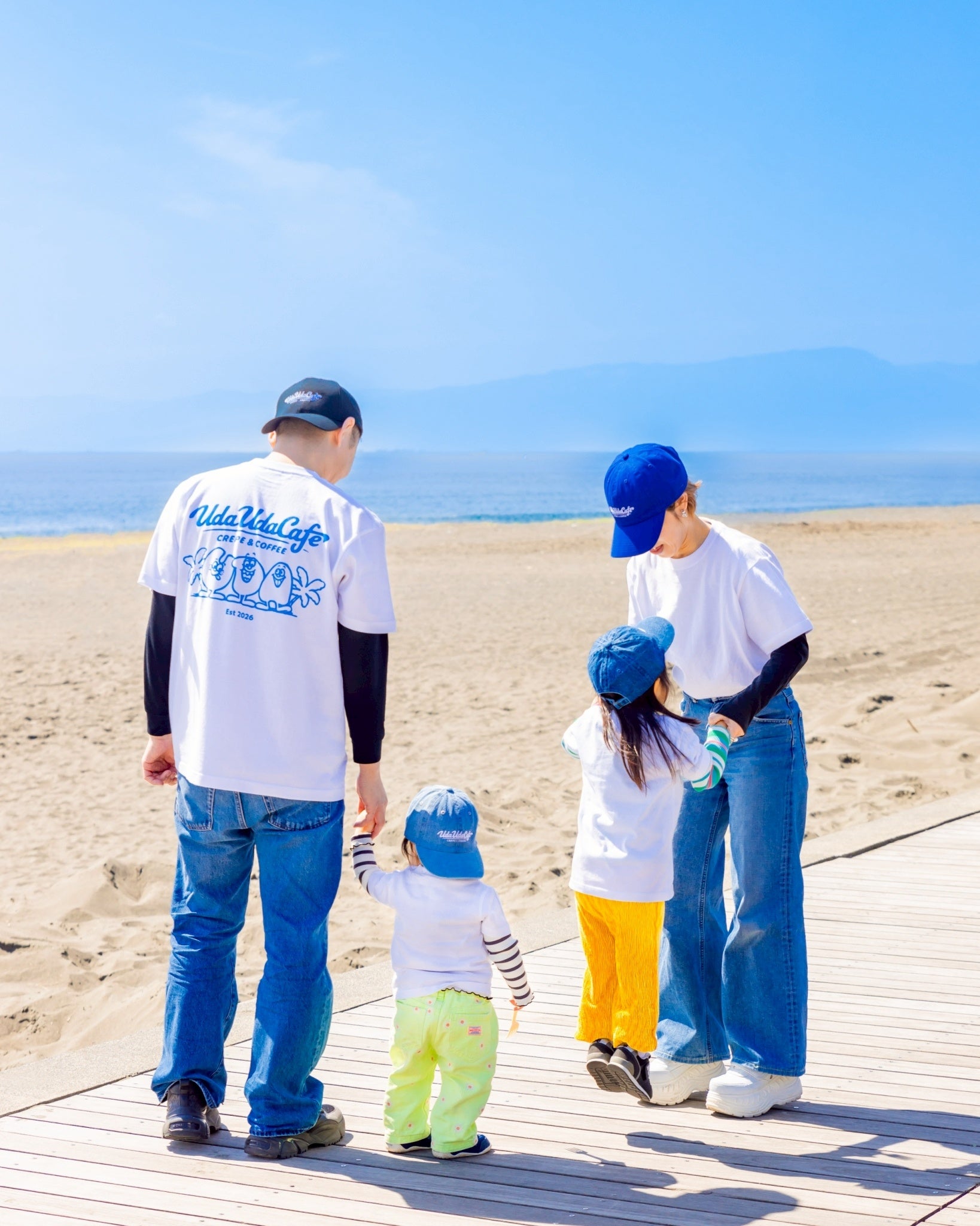 親子リンクコーデでおでかけをもっと楽しくする、アパレルグッズを販売。UDAUDACAFEのロゴのアメリカンなブルーが湘南の海に映える、さりげなく可愛らしいTシャツやデニム生地のキャップなども販売します。