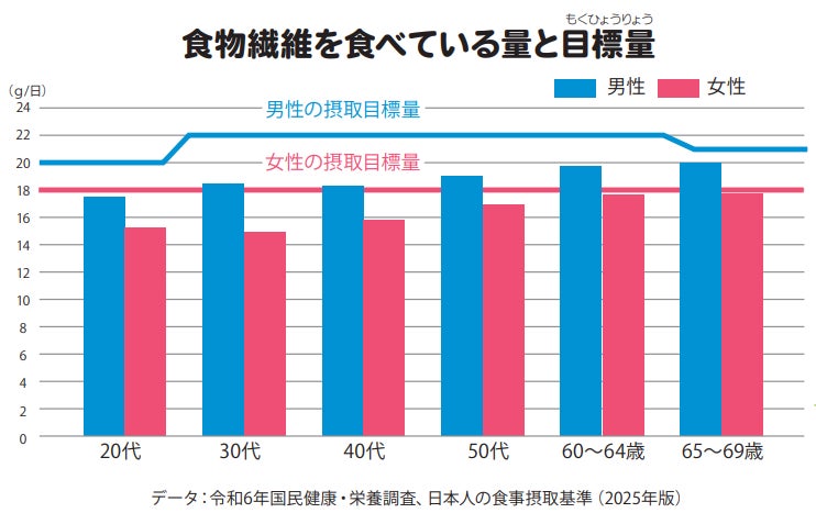 令和6年国民健康・栄養調査によると、日本人の1日の食物繊維摂取量は平均で18g程度であり、男女ともに目標値に届いていない状況となっています。近年は食の多様化により、穀類や豆を食べることが減り、食物繊維を食べる量が年々減っています。