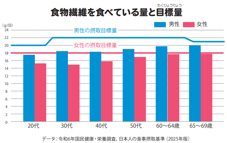 令和6年国民健康・栄養調査によると、日本人の1日の食物繊維摂取量は平均で18g程度であり、男女ともに目標値に届いていない状況となっています。近年は食の多様化により、穀類や豆を食べることが減り、食物繊維を食べる量が年々減っています。