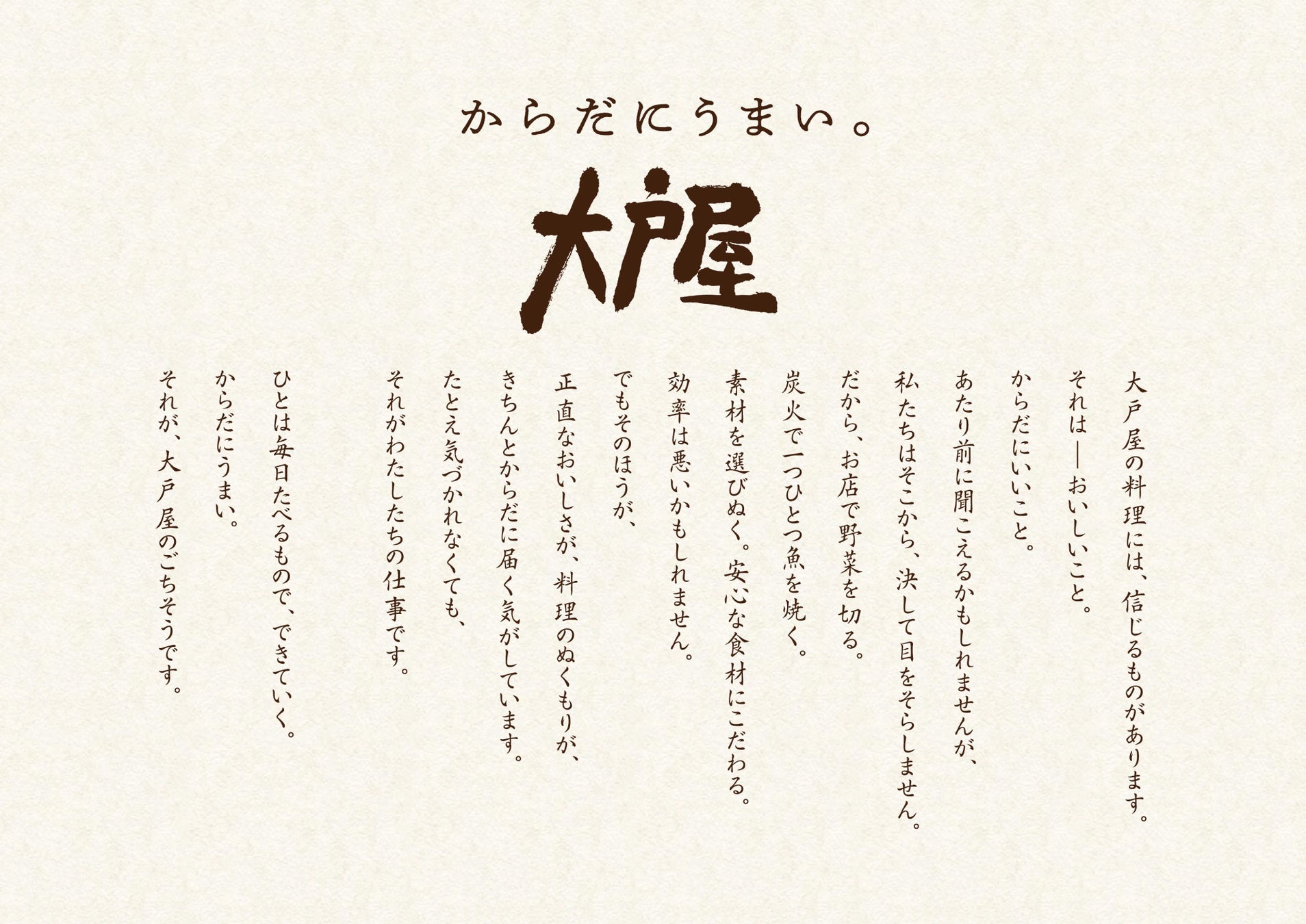 新ブランドスローガン『からだにうまい。』には、“おいしさ”を起点に心とからだの両方を満たしたいという想いを込めました。店内での仕込みや炭火焼きなど、ひと手間から生まれるおいしさが、健やかさにつながる。その価値を素材や店内調理へのこだわりとともに、メニューや店頭を通じてお伝えしてまいります。
