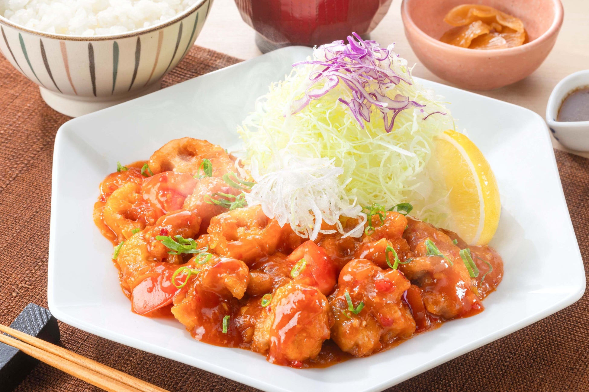 鶏の肩小肉の旨みと、れんこんの歯応えが楽しい中華風のおかずです。コクのあるチリソースで香ばしく炒め、ごはんが進む味わいに仕上げました。食感のアクセントとやみつきになる味わいで、最後まで飽きずにお楽しみいただけます。
