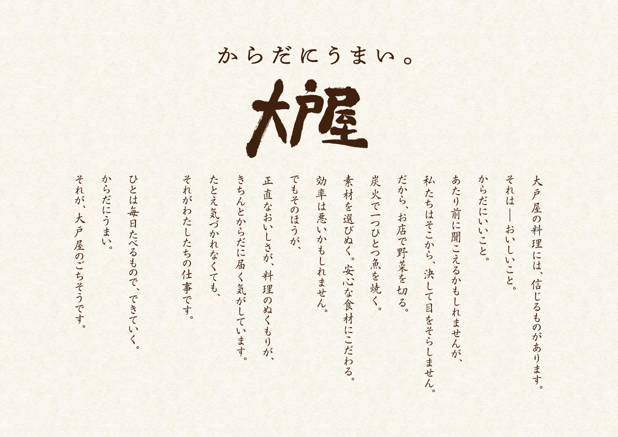 新ブランドスローガン『からだにうまい。』には、“おいしさ”を起点に心とからだの両方を満たしたいという想いを込めました。店内での仕込みや炭火焼きなど、ひと手間から生まれるおいしさが、健やかさにつながる。その価値を素材や店内調理へのこだわりとともに、メニューや店頭を通じてお伝えしてまいります。