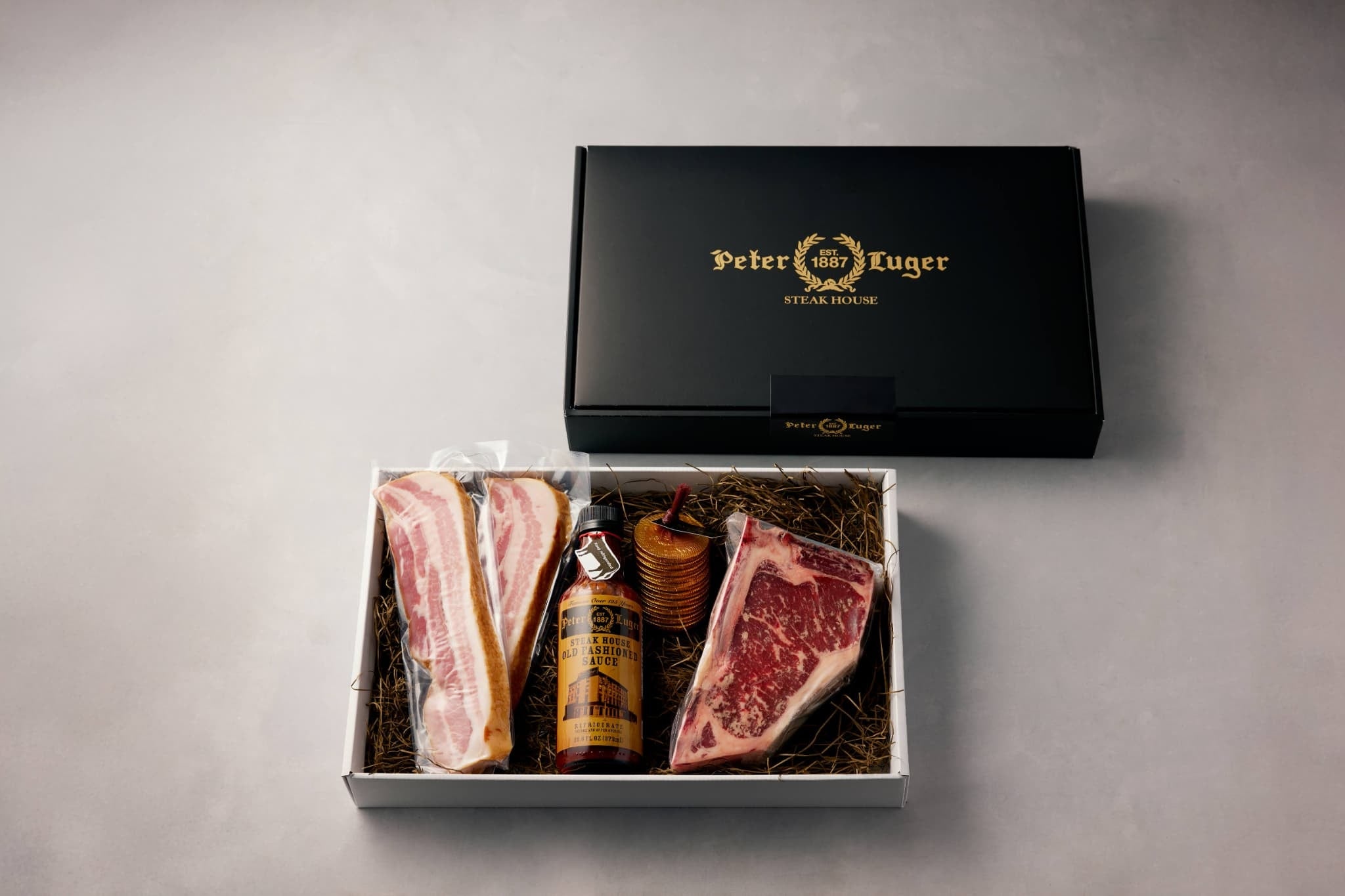 米国農務省が格付けした最上級ランク「プライム」の牛肉を使用した、チルドのサーロインステーキを中心に、店舗で使用しているオリジナルソースや調味料、プライベートラベルワインなど、ご自宅でもピーター・ルーガーの味をお楽しみいただけるEC商品を発売いたします。