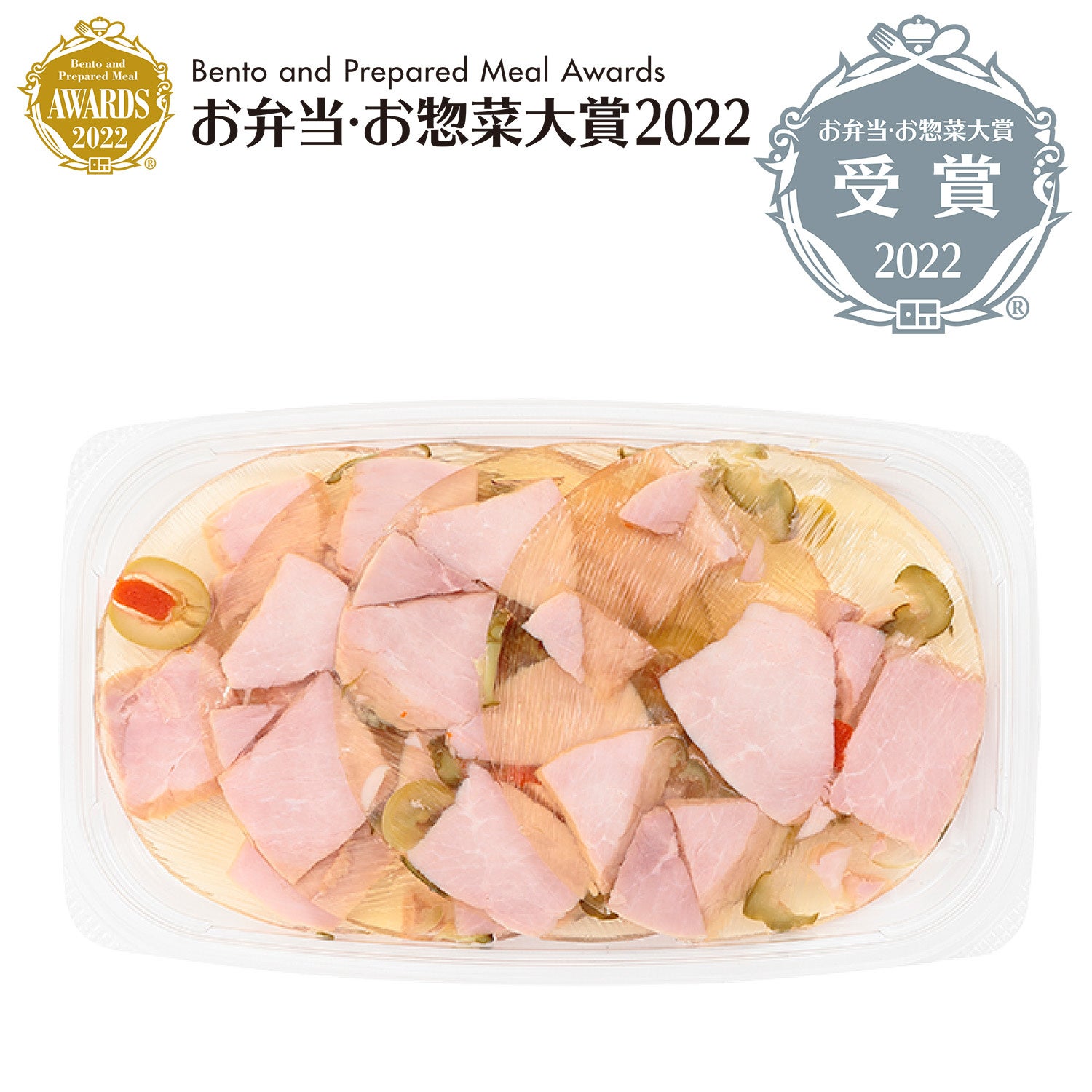 さまざまな具材をゼラチンで固めた、彩り綺麗なアスピックゼラチンハム惣菜で、お酒と相性が良く、オシャレ感と高級感があり、オードブルメニューとしても好まれています。スライサーでゼリーの形が崩れないように、そしてもっとも食べやすい形で、絶妙な厚さにカットされており、ゼリー状に加工してもハムの旨味をしっかりと味わえるところがポイントです。