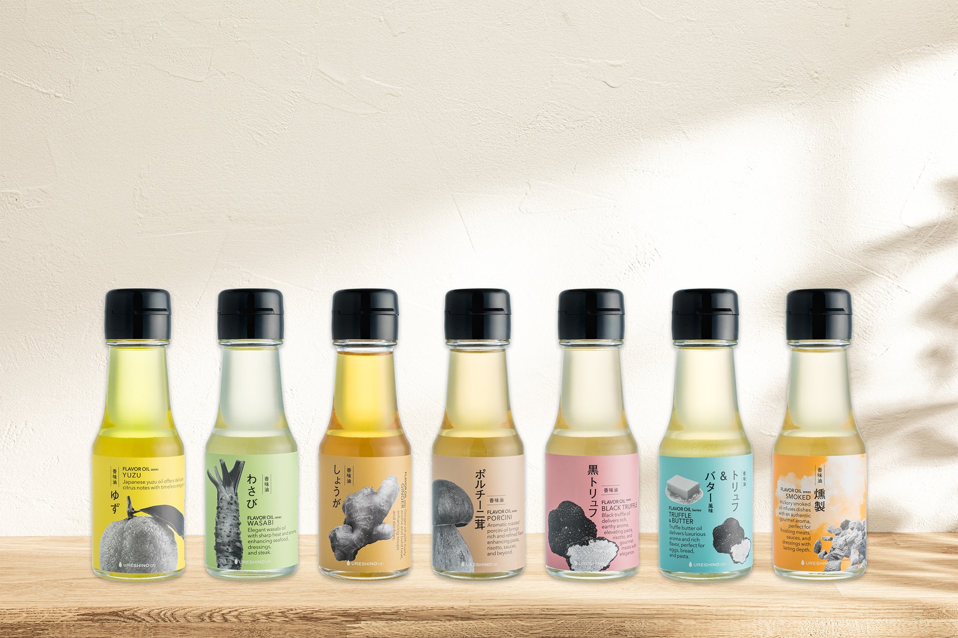 フレーバーオイルシリーズは、調理の最後に使用する「仕上げ用オイル」として開発されました。ゆず、わさび、しょうが、ポルチーニ茸、黒トリュフ、トリュフ&バター風味、燻製の7種類を展開。それぞれ異なる香りや風味の特性により、料理に余韻を加えます。