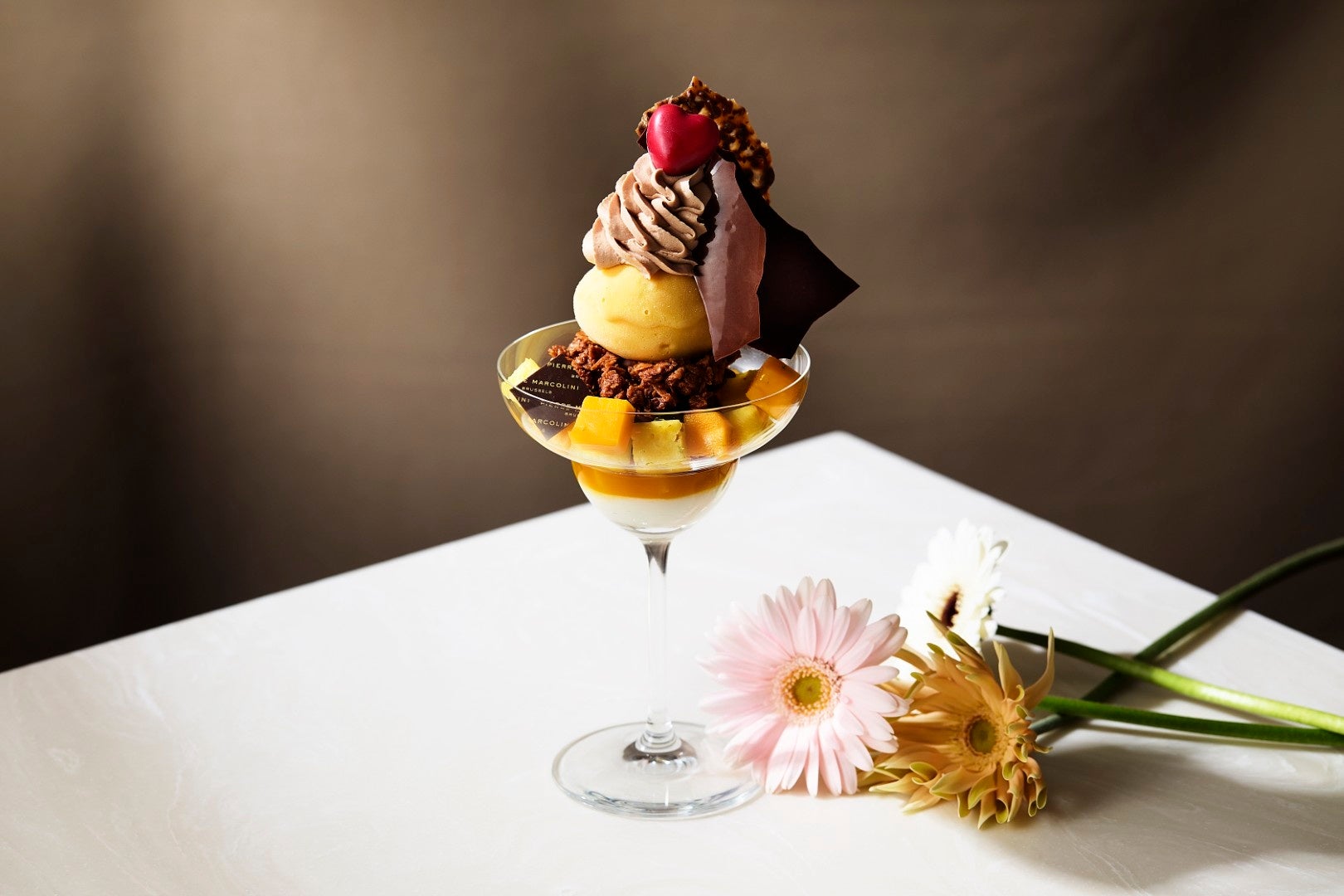 層仕立てのパフェは、やさしい口当たりの杏仁豆腐をグラスの底に配し、果実の甘みと酸味が特徴のバナナ・マンゴーパッションクーリ、しっとりとしたブラウニーとヒマラヤンブレンドティーガナッシュを重ねました。さらに板チョコやチョコレートカード、香ばしいプラリネフィアンティーヌで食感にアクセントを加え、トップにはライムの皮でマリネしたマンゴーとパイナップル、果実味あふれるマンゴーパッションソルベをあしらいました。仕上げにチョコレートシャンティ、チュイルカカオと2種の板チョコ(ノワール&ミルク)とともに、ピエール マルコリーニを象徴する赤いハート「クール フランボワーズ」を添えています。