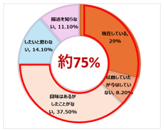 健康意識の高まりにより、現在約75%の人が「腸活」に関心を持ち、そのうち29%がすでに実践しています。