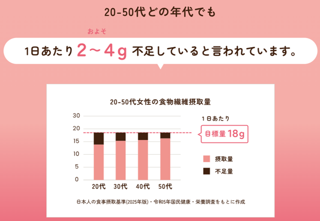 乳酸菌の栄養源となる水溶性食物繊維が不足すると、乳酸菌が十分に活性化されません。現代の日本人は、1日あたり約2〜4gの食物繊維が不足していると言われています。