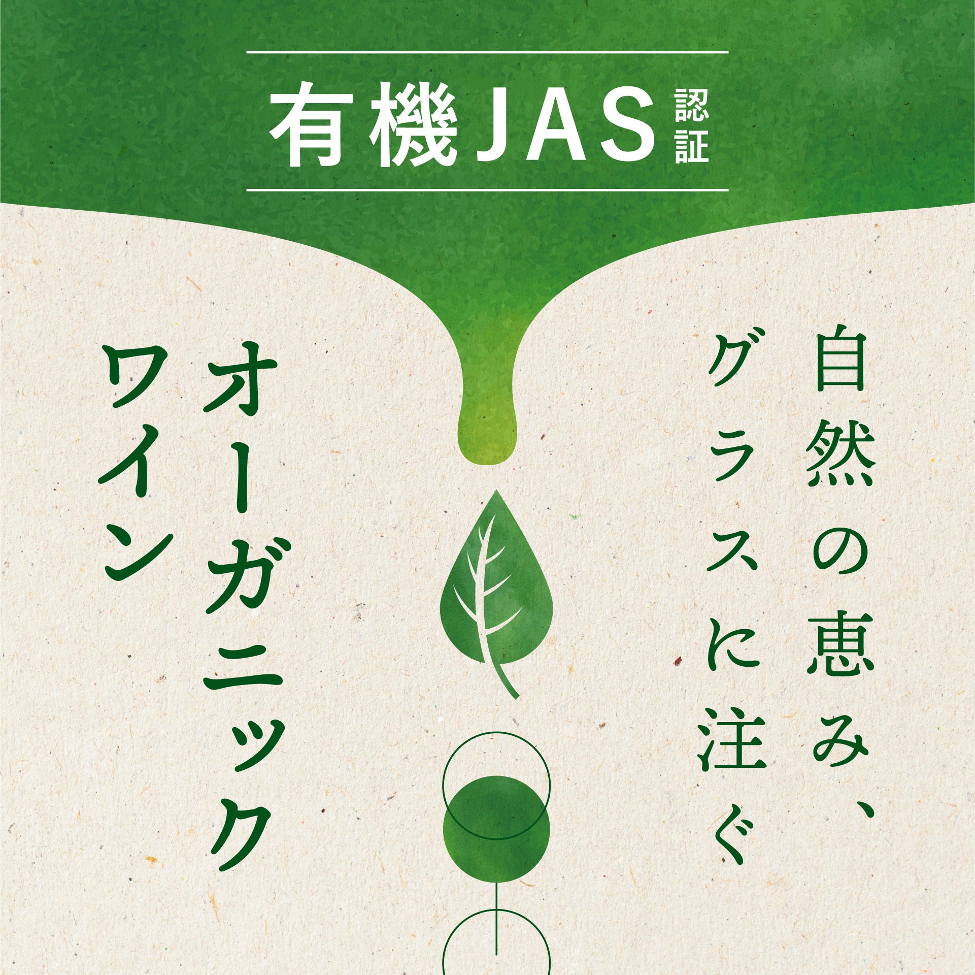 具体的な取り組みとして、社内の販促企画を担うプロジェクトチーム主導のもと、「有機JAS認証首掛け」を制作しました。首掛けには「自然の恵み、グラスに注ぐ」というキャッチコピーを採用しています。ワインはブドウを原料とする農産物由来の酒であり、農薬や化学肥料に頼らず育てられたブドウから造られるオーガニックワインは、まさに自然の恵みそのものです。