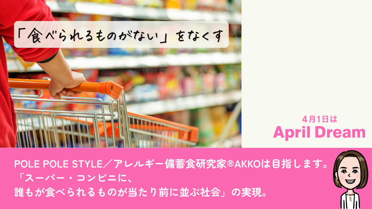 当方は、4月1日を夢を発信する日にしようとするApril Dreamに賛同しています。このプレスリリースは「POLE POLE STYLE/アレルギー備蓄食研究家®AKKO」の夢です。
