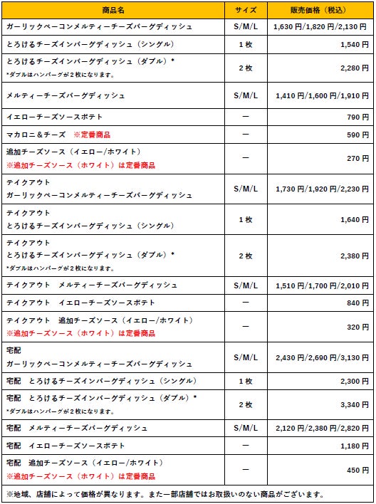 ディッシュメニューでは、ガーリック、ベーコン、3種のチーズのハーモニーが愉しめる「ガーリックベーコンメルティーチーズバーグディッシュ」。ハンバーグの中にシュレッドチーズを詰め込み、さらに上からチーズソースをかけた「とろけるチーズインバーグディッシュ」。いつものチーズバーグディッシュに濃厚なイエローチーズソースがかかった「メルティーチーズバーグディッシュ」3種を販売いたします。