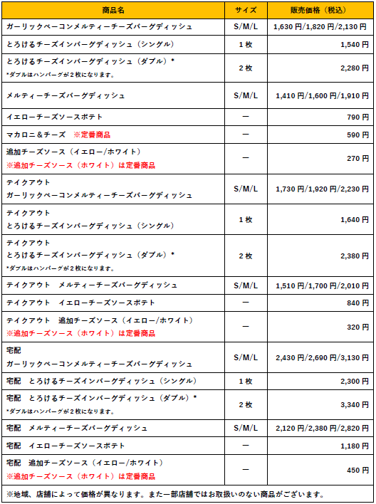 ディッシュメニューでは、ガーリック、ベーコン、3種のチーズのハーモニーが愉しめる「ガーリックベーコンメルティーチーズバーグディッシュ」。ハンバーグの中にシュレッドチーズを詰め込み、さらに上からチーズソースをかけた「とろけるチーズインバーグディッシュ」。いつものチーズバーグディッシュに濃厚なイエローチーズソースがかかった「メルティーチーズバーグディッシュ」3種を販売いたします。