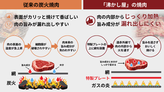 そこで、沸かし屋では、オリジナルの特製プレートを挟むことで、お肉を高温に晒さず比較的低温で、お肉の中からじっくりと熱を伝えて沸かすことによってお肉本来の旨味成分を閉じ込めて焼き上げるので、炭火焼肉とは違うこれまでにない新しい美味しさをご堪能いただけます。