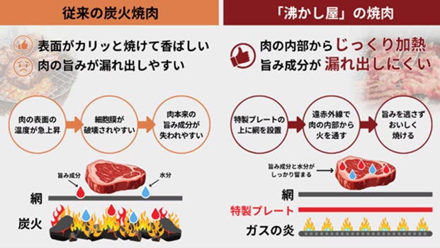 従来の炭火焼肉と「沸かし屋」の焼肉の比較画像です。