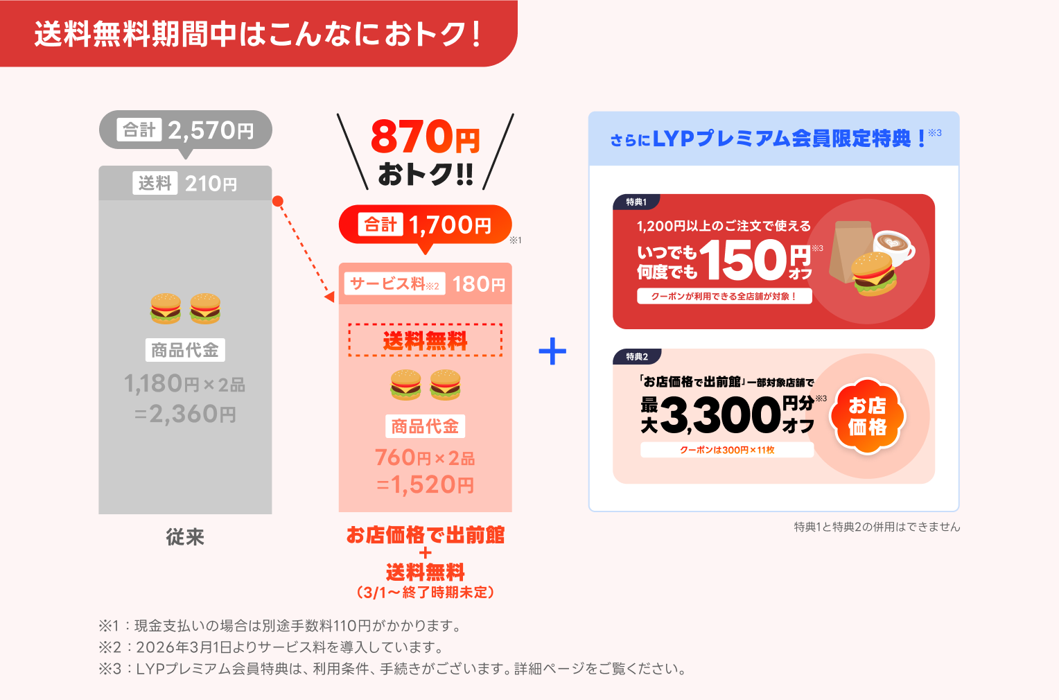 ※1:別途サービス料がかかります。また現金支払いの場合は別途手数料110円がかかります。