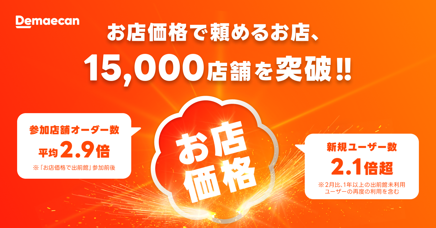 株式会社出前館は、運営する日本最大級のデリバリーサービス「出前館」において、2026年3月1日(日)より全国展開を開始したお店と同じ価格でデリバリーを楽しめる「お店価格で出前館」の対象店舗数が、2026年4月1日(水)時点で約15,000店舗を突破したことをお知らせいたします。なお、そのうち13,000店舗以上が、すべての商品をお店価格でご注文できる店舗です。