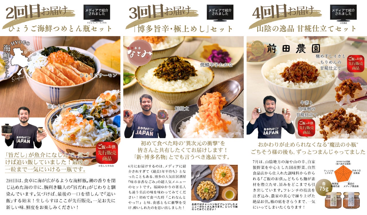 本サービスは毎月1回・全6回、おかわりJAPANが厳選したご飯のお供が届くサブスクです。毎回異なる産地・生産者の逸品が届くため、開けるたびに新しい発見と食の楽しみを感じられることでしょう。