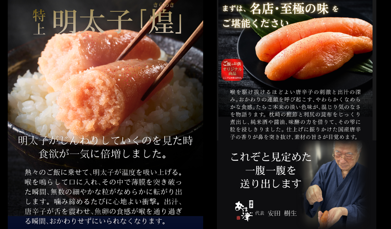 【The Otomo】の栄えある1回目を任されるのは、博多明太子の名店「あき津゛」がこのサブスクをきっかけに特別商品化した手仕込み天然だし明太子「煌(きらめき)」(160g)です。