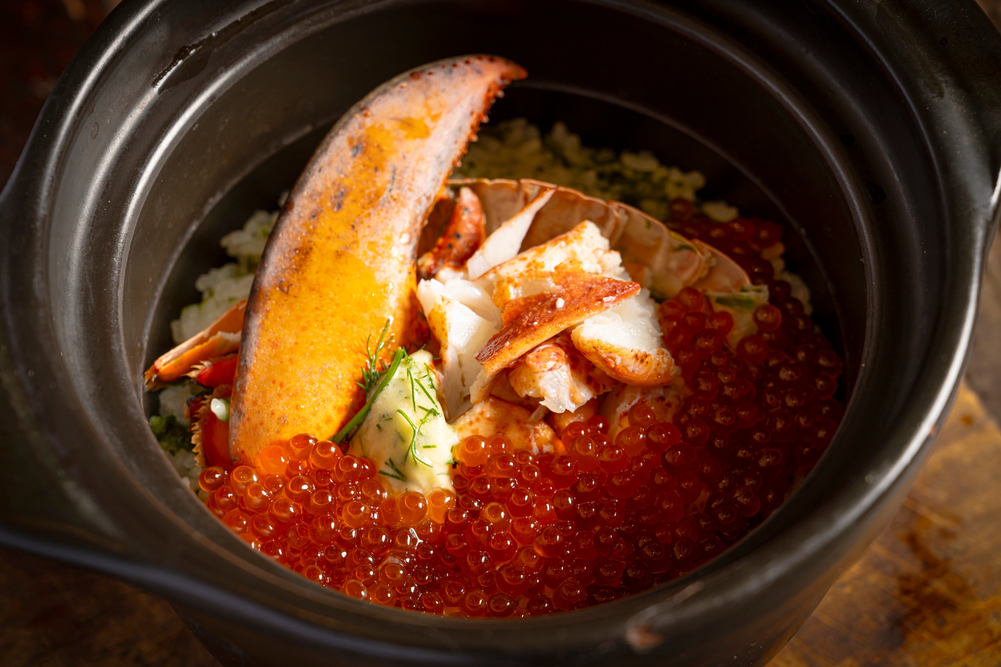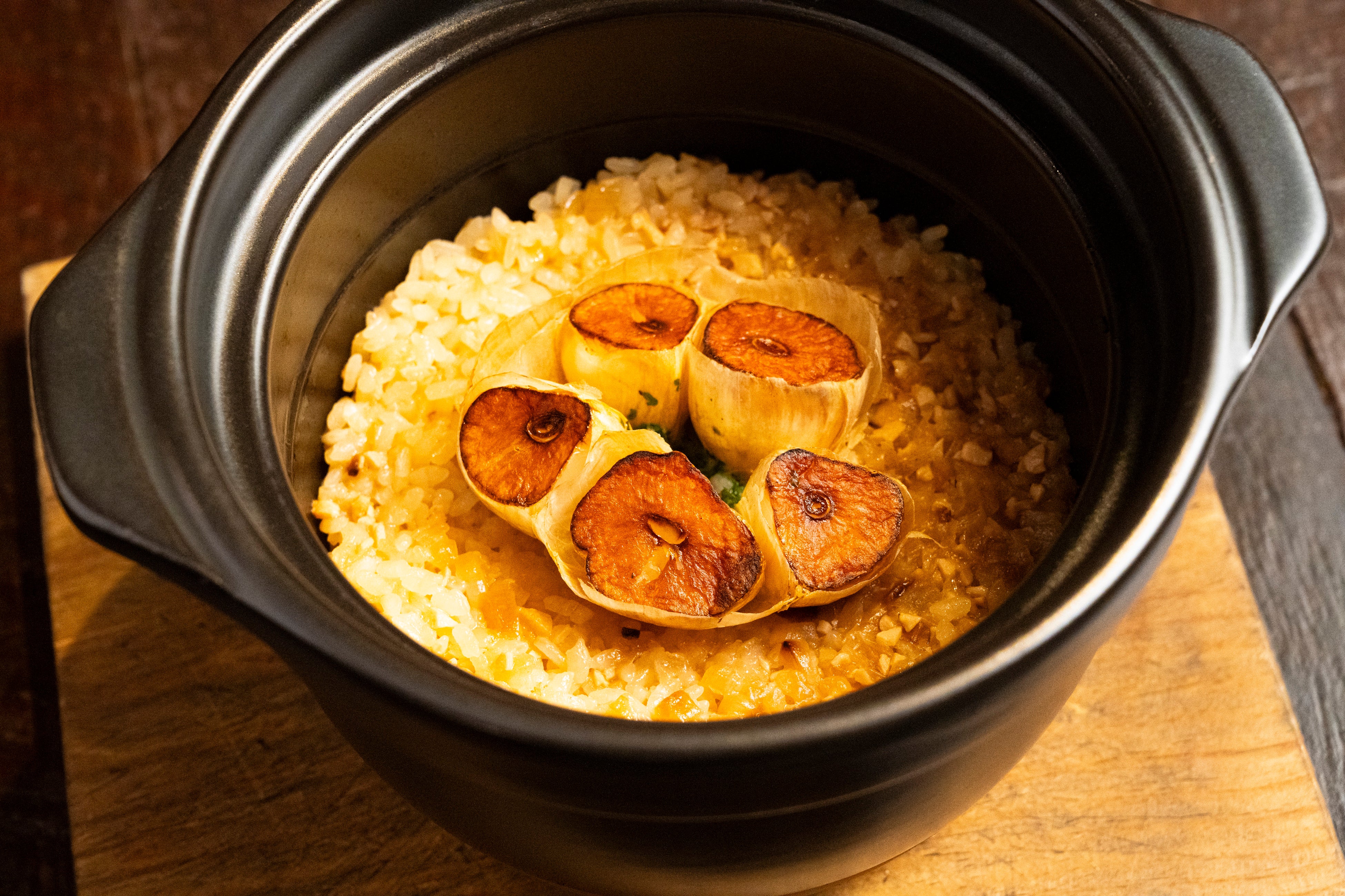 【BISTRO】×【釜炊き米】のんきが手掛けるお米がススムビストロは、肉と野菜の旨味が凝縮したブロード(洋風だし)でご飯を炊きあげます。なかでも名物は「青森県産ニンニクのガーリックライス」。前述したブロードと、隠し味には自家製のガーリックオイルをまぜあわせ高火力で釜炊き丸ごとローストした青森ニンニクを仕上げにのせれば完成釜蓋をあけた瞬間ひろがる湯気にのった香りは食欲をくすぐること間違い無しです。季節毎の旬の食材を使用した炊き込みご飯もご用意しており、見た目も楽しく食べ応えのある逸品となっています。