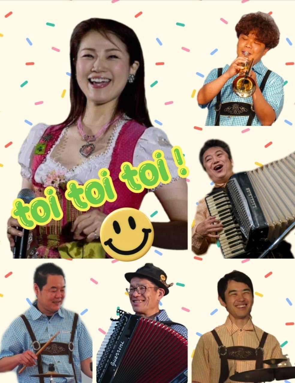 “toi,toi,toi!”(トイトイトイ!)とは、ドイツのおまじないの一つで、「上手くいくよ!」「大丈夫!」といった、相手の成功や幸せを祈る言葉。美味しいビールやお料理、そして私たちの音楽。飲んで食べて歌って踊って大いにお楽しみいただけます。