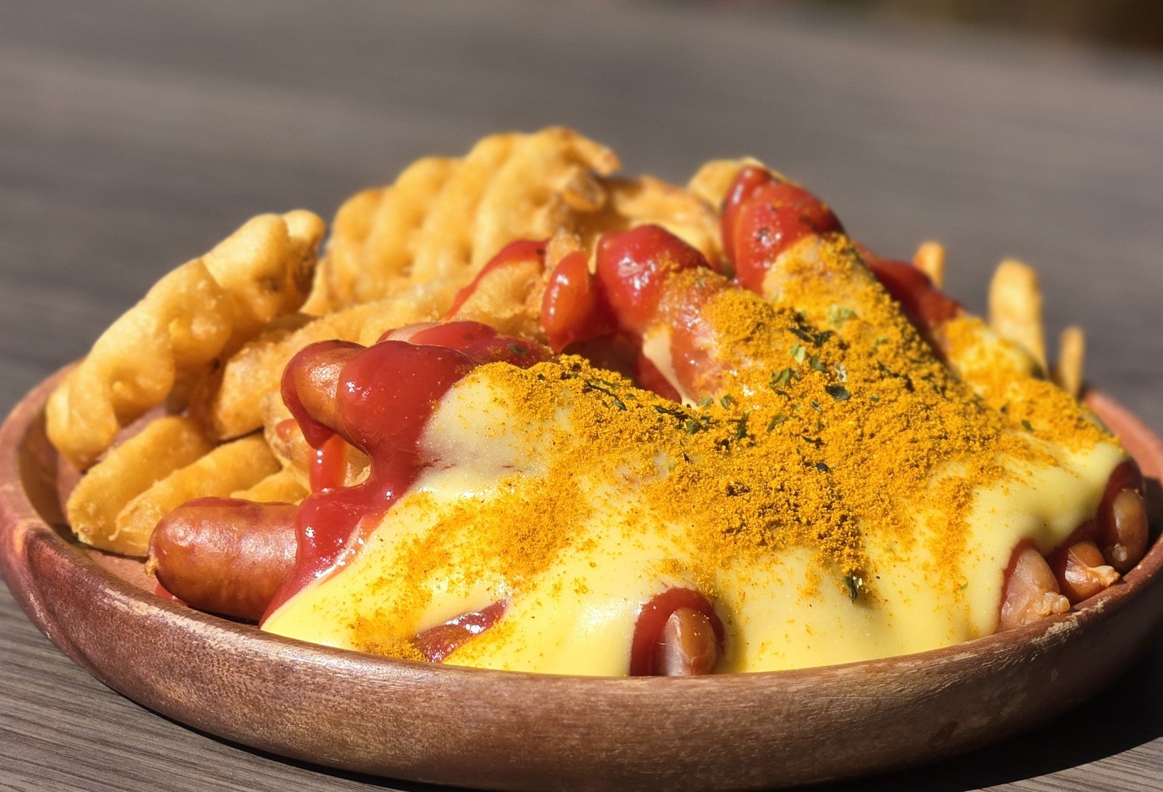 ドイツベルリン街角名物フード!パリッとジューシーなソーセージをグリルし、たっぷりのトマトソースと食欲をそそるカレー風味のパウダーをかけた定番ドイツフードにとろけるチーズをトッピングした人気No.1メニュー!