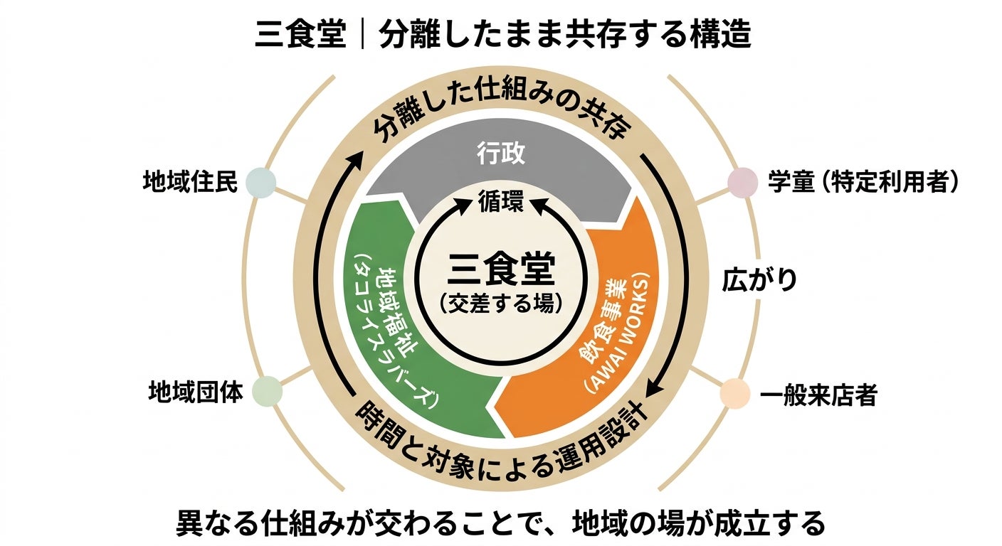 三食堂で構築した本モデルは、異なる制度や収益構造を持つ主体が共存するための設計手法として、地域における新たな場のあり方を提示するものです。
