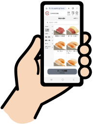 様々な商品を見ながら新たなおすしに巡り合える楽しさ、選べる楽しさを味わえる回転すしの醍醐味を、画面上で再現した大型タッチディスプレイです。流れるおすしを映像で見ながら、画面を指で操作し商品を注文することができるほか、みんなで画面を見ることができ、同時に操作も可能です。