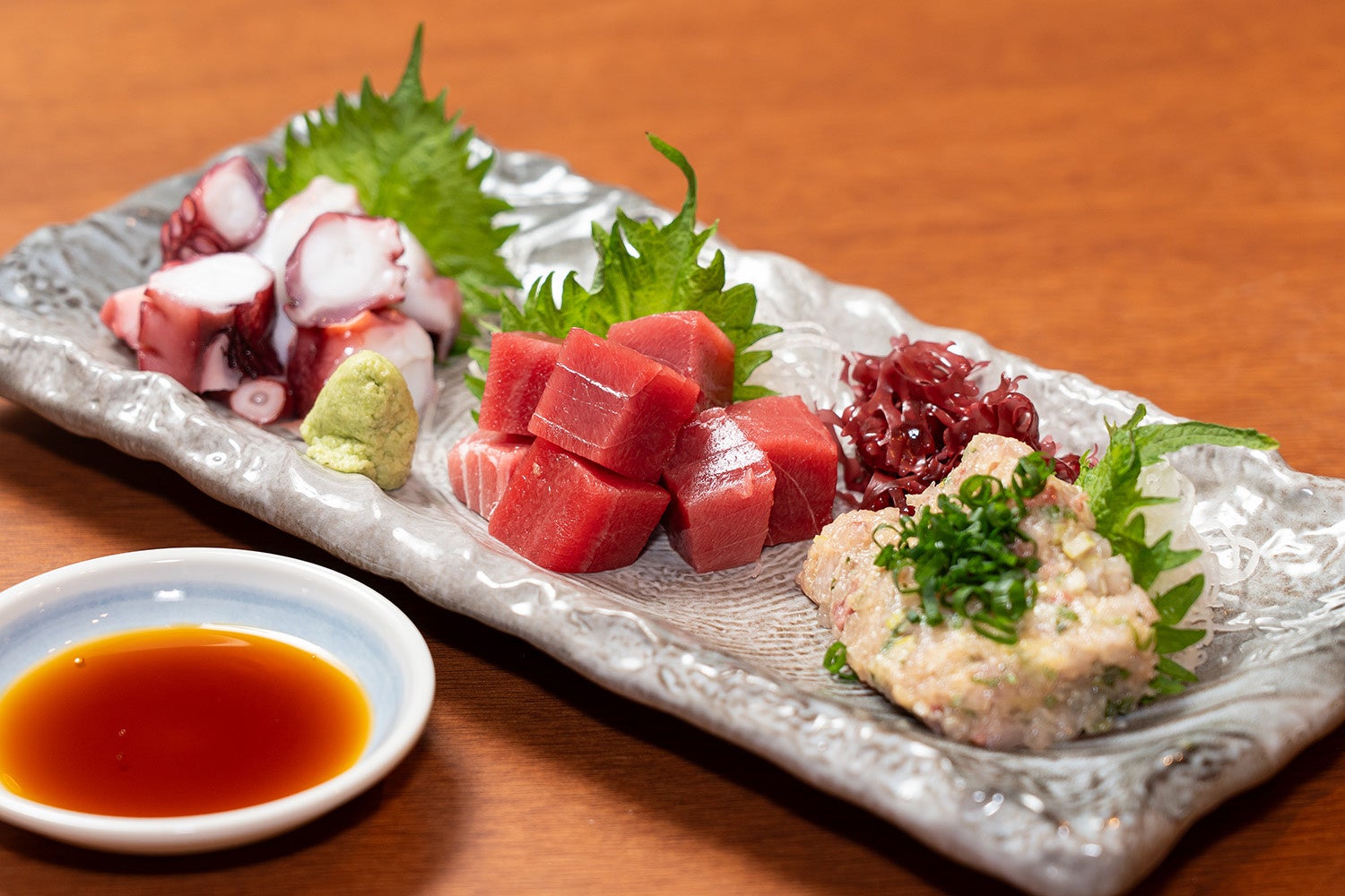 名物の「もつ煮込み」(450円)も、『満天酒場』を象徴する一皿です。開業以来20年以上守り続けてきたオリジナルの白湯ベースで仕上げており、何時間もかけて丁寧に煮込むことで、深いコクと旨みを引き出しています。さらに、特製の辛味噌を加えることで味の変化も楽しめます。新鮮な刺身も見逃せません。「鮪ブツ」「タコブツ」(各390円)は、豊洲市場直送ならではの鮮度で、しっかりとした質の高さを感じられます。
