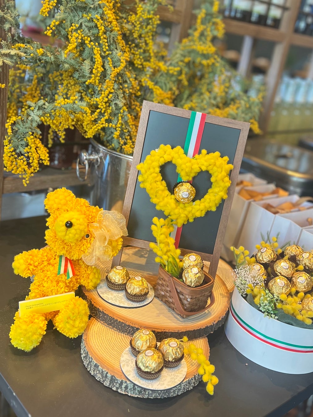 お客様の反応としては、FESTA DELLA DONNA/国際女性デーの認知度もここ数年で上がってきているようで、イタリアでのミモザを送る習慣も知られていた。女性限定でお配りしたフェレロ ロシェも好評で、当店ではランチはワーカーさんの利用も多く「仕事の疲れも癒される」「なかなか感謝を直接表現されないこともあるのでとても嬉しい」といった声も多くありました。