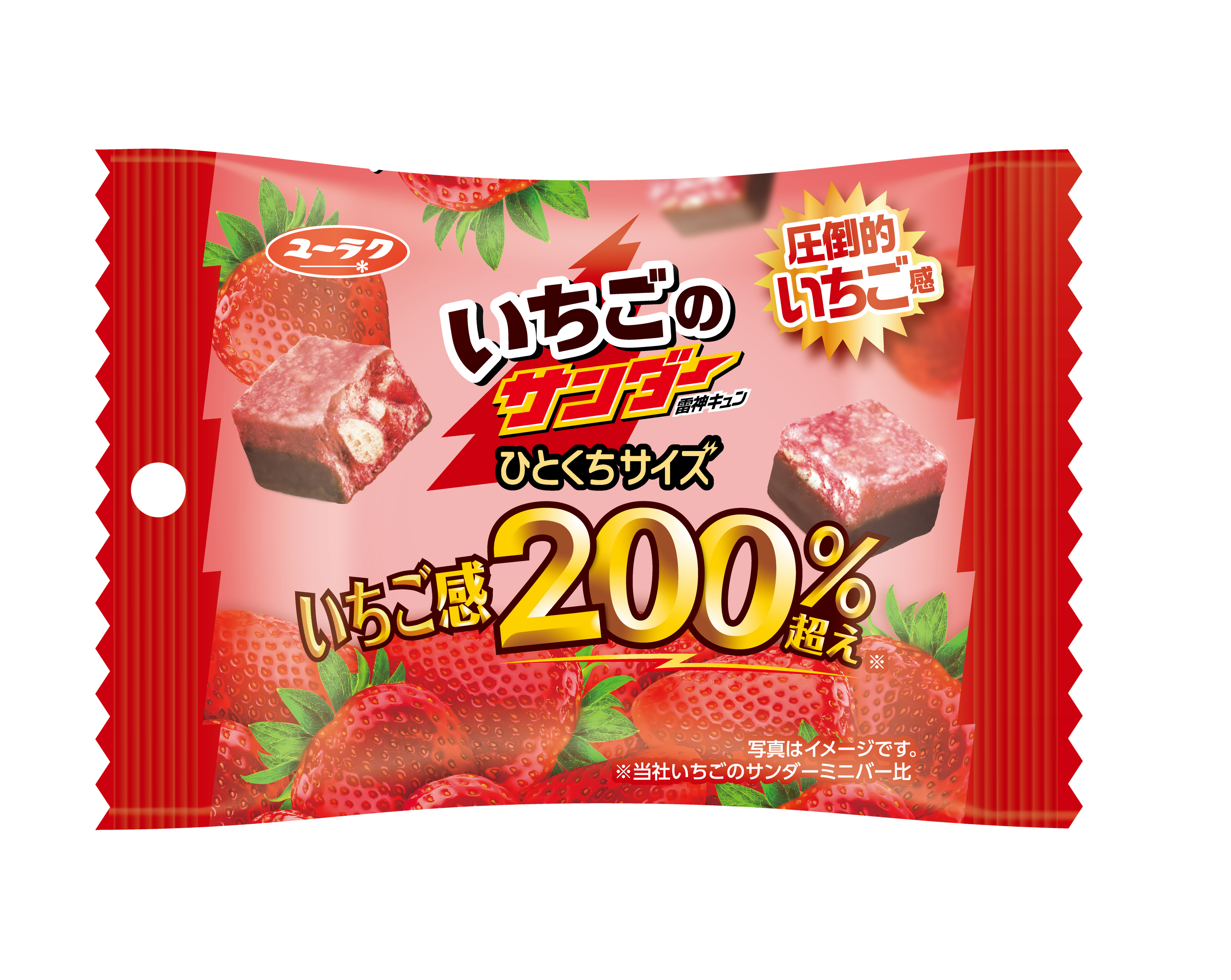 今回発売する「いちごのサンダーひとくちサイズ いちご感200%超え」は、「チョコ感200%超え」で培った“濃さへの期待”に応えるかたちで、いちごの風味を主役に据えた商品です。