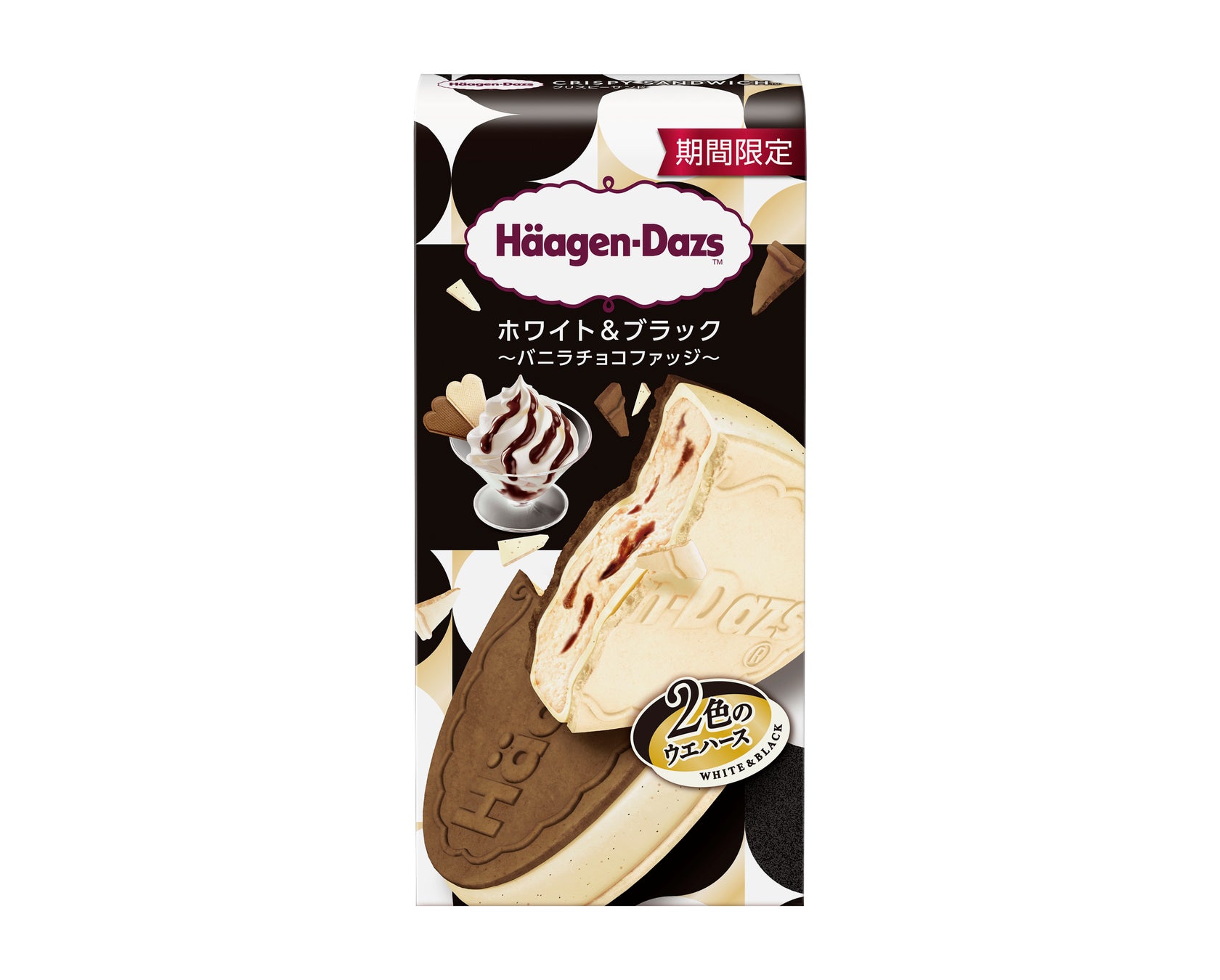 ホワイトウエハースとココアウエハースでサンドし、白と黒の印象的な見た目とともに、どちらを上にして食べるかで、味わいの感じ方も変わります。
